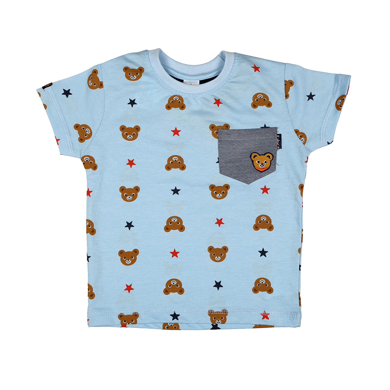 Keep your little boy comfortable and stylish with this soft cotton T-shirt. Designed in a soothing blue shade, it features an all-over teddy bear print with tiny red and navy stars, adding a playful touch. The contrasting grey pocket with a teddy embroidery enhances the charm of this tee. Perfect for everyday wear, playdates, or outings, this T-shirt pairs easily with shorts or jeans for a cute and comfy look all day long.